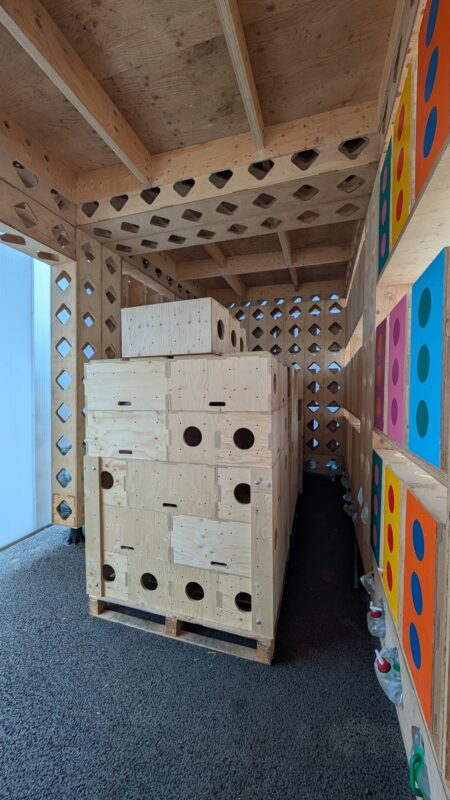 They can turn up completely flat packed, then using simple off the shelf screws and a driver, put together in minutes. They can then be bolted together to create various structures and shapes. Once the parts are dismantled, they are able to be taken to other locations for further use, or put into our storage container (made of more boxes), until required again. This is part of our usual effort to promote a circular economy. If these units are no longer required at a certain location, we can hopefully offer them to another project, as part of our circular principles.
