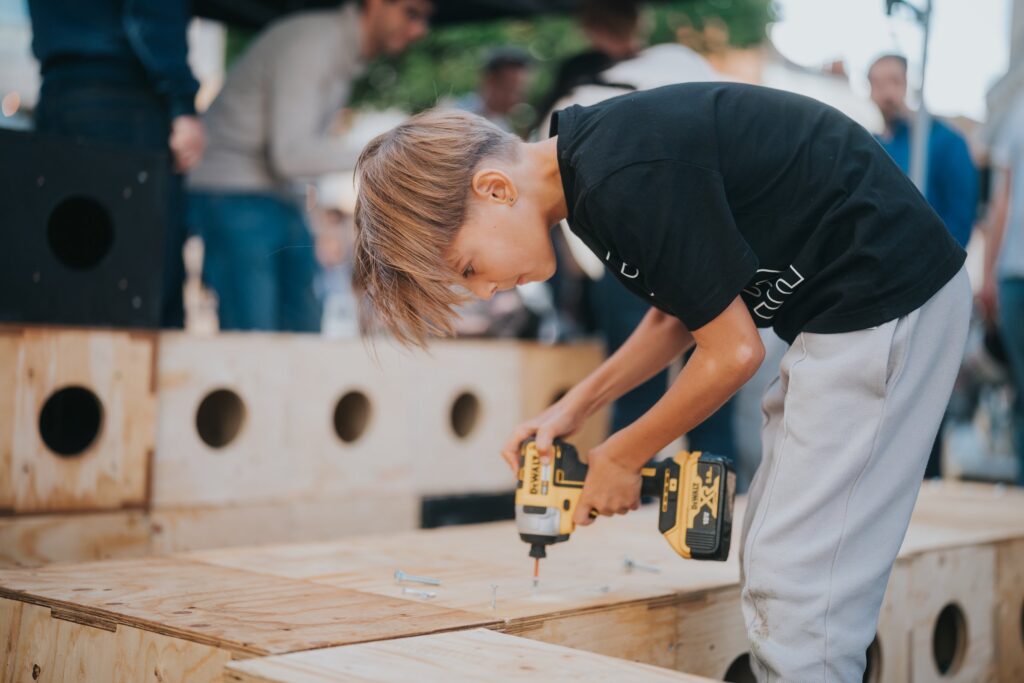 We worked with Hemingway designs to be a part of Centre Stage. On George Street in Richmond, we were there all day, to help ‘Build your own street furniture’. Once again our Box library sprang to life.